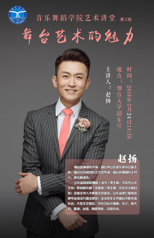 5月24日下午,太阳成集团tyc234cc艺术讲堂第二期正式开讲,本次讲座邀请烟台市歌舞剧院主持人赵扬老师为全院师生做了题为“舞台艺术的魅力”的主题讲座,讲座由经理助理仲欣老师主持。