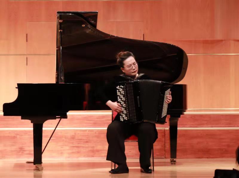 孟繁、廖宇星老师为大家演奏了四手联弹作品《卡门》,乐曲由开始的活泼明快到轻柔舒缓,再过渡到振奋人心,精妙的技法让观众叹为观止。接下来出场的是美国教师,派特里克·巴赫曼,同学们都亲切地称呼他为“小派老师”,热爱中国文化的小派老师给大家带来了一首他非常喜欢的中国作品——《山丹丹开花红艳艳》,时而舒缓,时而明快的乐曲收获了观众雷鸣般的掌声。由胡琳老师演奏的两首风格迥异的手风琴乐曲:《遗忘》与《帕蒂塔》,复杂多变的演奏技巧、庄严的快板和惊慌的急板的结合,给观众带来丰富的视听盛宴。而田琳老师带来的《野蛮的快板》整首乐曲节奏复杂和多变,同时使用大量匈牙利民族特色的不和谐和声,极具挑战性。