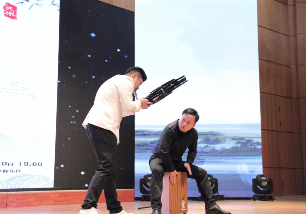 音乐会在齐瑶老师、崔潇然老师、姚金佳老师带来的弹拨乐三重奏《春江花月夜》中拉开帷幕,琵琶、古筝和扬琴三种古典乐器的碰撞,声声入耳,给观众带来了一场清新流畅而又跌宕起伏的听觉盛宴。紧接着由刘海滨老师带来的唢呐独奏《山乡春》,配合笙、鼓等民族乐器,轻松质朴,引人入胜,华彩乐段的前部分旋律,在高音区辗转迂回,高亢激越的音调用循环换气,一气吹成,赢得了观众雷鸣般的掌声。接下来是李明轩老师带来的《笙即兴表演》,与张东升老师的箱鼓相配合,律动的节奏、完美融合的表演,带动了全场观众的热情,纷纷用手打着拍子应和。最后由齐瑶老师带来的中阮独奏《云南回忆》,悠扬的钢琴与轻松明快的中阮完美结合,相得益彰,大放异彩。至此,太阳成集团tyc234cc为庆祝改革开放40周年艺术月圆满落幕。