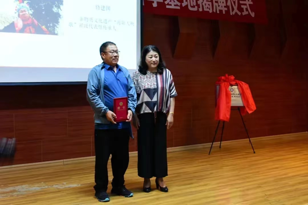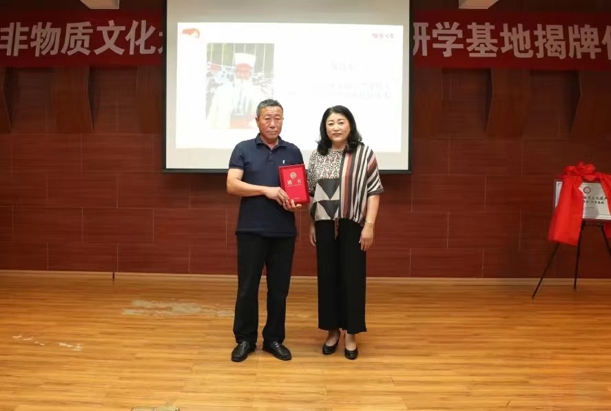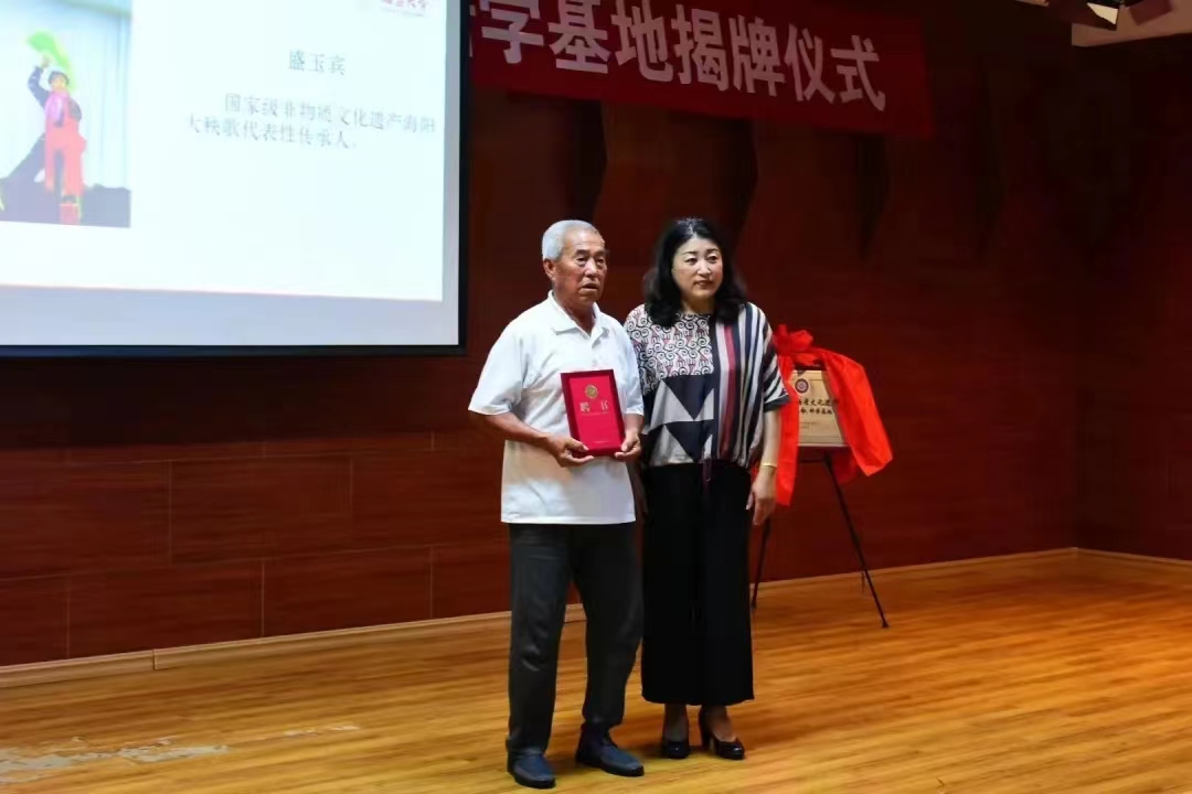 随后,邹淑珍经理为海阳大秧歌代表性传承人于信、盛玉宾、修建国、鞠进东颁发太阳成集团tyc234cc“海阳大秧歌”研学专家聘书。