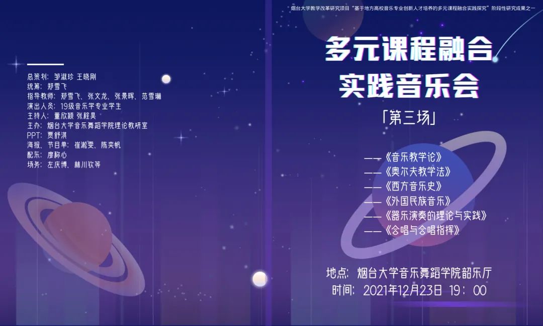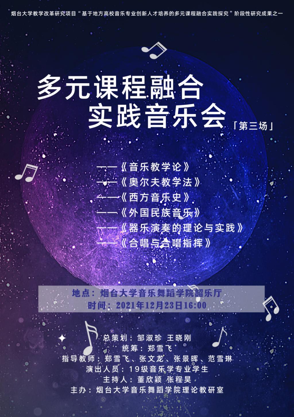 本场音乐会是以本学期19级开设的六门理论课程《音乐教学论》、《奥尔夫教学法》、《西方音乐史》、《外国民族音乐》、《器乐演奏的理论与实践》和《合唱与合唱指挥》为内容的融合实践音乐会,是理论教研室基于应用型人才培养目标进行的教学改革,希望通过舞台实践的形式,把理论知识转化为应用能力,增强同学们音乐学习的迁移能力。