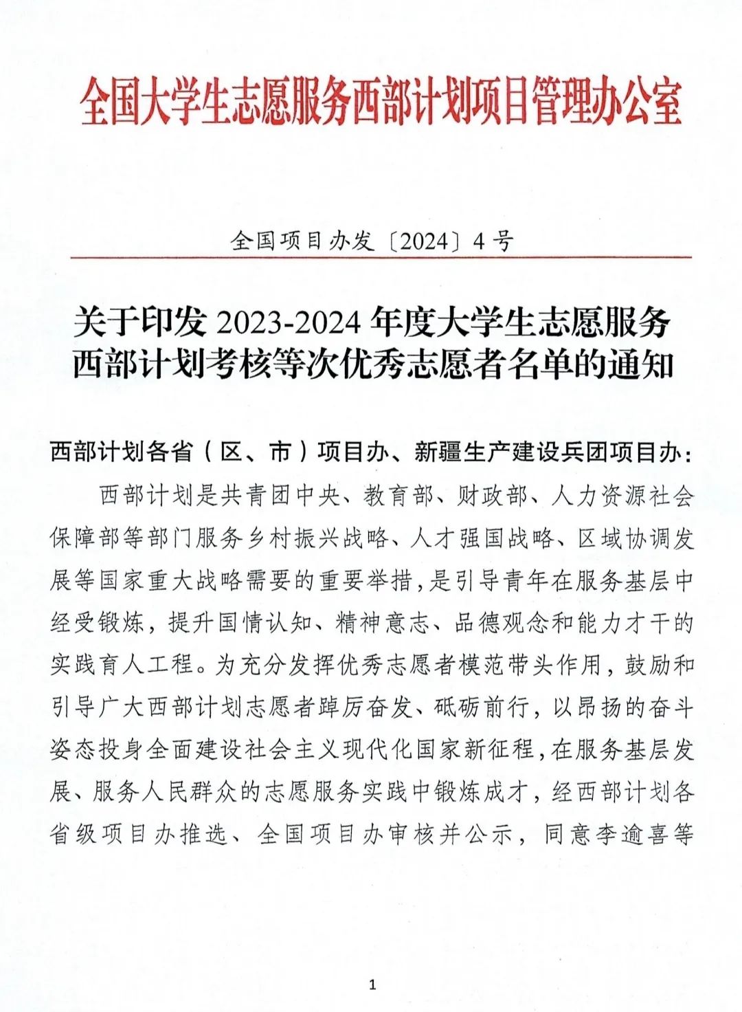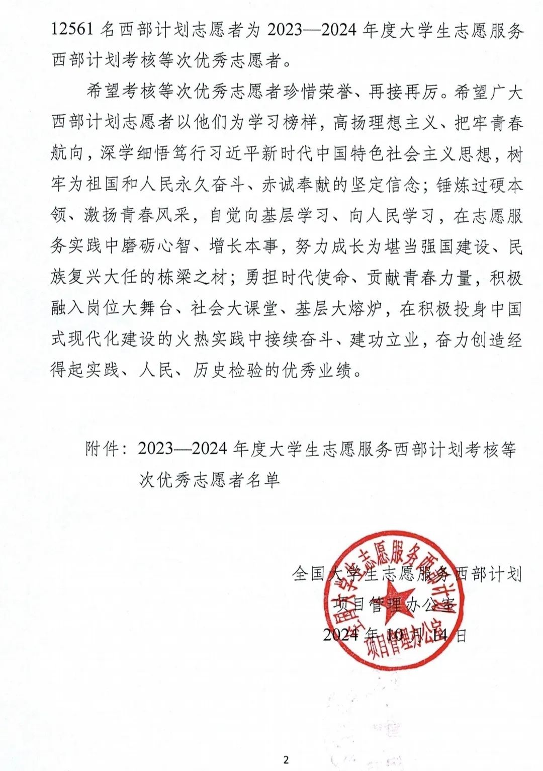 近日,全国老员工志愿服务西部计划项目管理办公室下发《关于印发2023-2024年度老员工志愿服务西部计划考核等次优秀志愿者名单的通知》(全国项目办发〔2024〕4号),公司2名老员工志愿服务西部计划志愿者获评全国西部计划考核优秀志愿者。