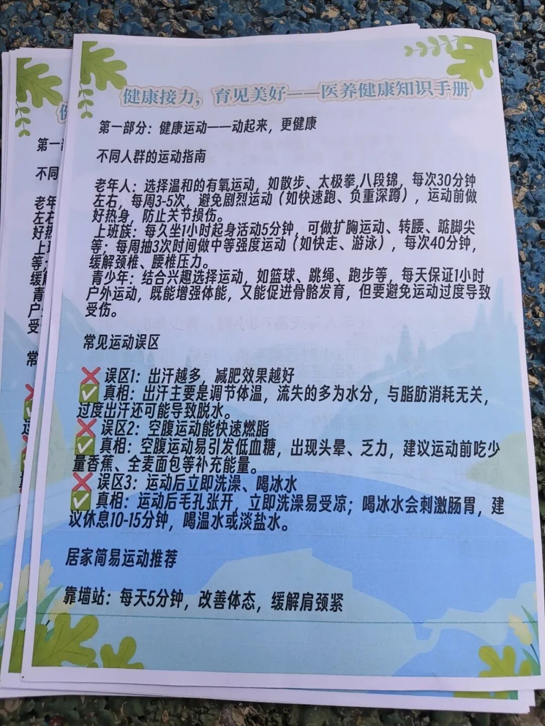 而在大家尤为关心的运动话题上,团队成员更是重点“划了线”——详细介绍了像太极拳、慢走、广场舞等特别适合长辈的运动类型,耐心叮嘱大家运动时要根据自身情况控制好强度和时长,比如饭后不宜立即剧烈运动,天气过冷或过热时最好选择在室内活动。同时,还现场纠正了不少老人们日常运动中的误区,比如有些人觉得“运动越累效果越好”,其实不然,适度且坚持才是对身体最有益的。一番讲解下来,老人们听得频频点头,不时拿出手机拍下重点内容,现场互动十分热烈。