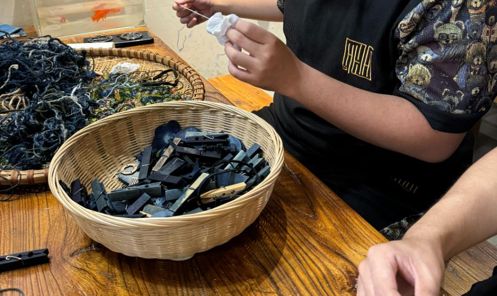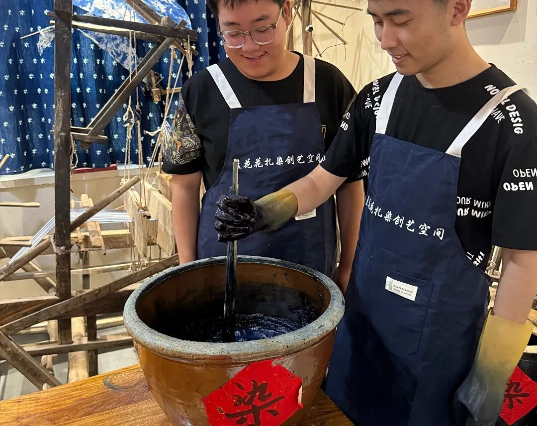 队员们试着操作,却因扎结松紧不当而导致染色后图案杂乱。传承人笑着示范:“扎结要顺着布料纹理,力道得均匀 。”大家发现,扎染藏着不少巧思,像独特花型能用普通的玻璃珠辅助呈现。看似简单的扎结、浸染,实际操作起来,才懂这门以植物染色为核心的技艺,耗时长、考验耐心,并非易事。也深知手工扎染“慢工出细活”,可耗时长、收益低,年轻人鲜少问津,传承难题摆在眼前。队员们积极调研扎染衍生品开发与市场现状,探索非遗传承的创新路径,为探寻扎染的可持续传承积累宝贵经验。