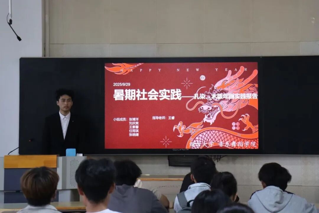 本次暑期社会实践共组建10支实践团队,覆盖“艺术支教”“非遗传承调研”“红色文化传播”“社区文艺服务”等主题。答辩会现场,各团队代表依次上台,通过PPT、视频资料与生动的讲解,图文并茂地还原了实践历程。“儒风舞韵”支教团深入偏远山区小学,为孩子们带去了系统的音乐、舞蹈启蒙课程,用艺术点亮了孩子们的心灵之窗。“鲁韵先锋”社会实践队聚焦地方非物质文化遗产,走访民间老艺人,他们将采风成果进行现代化编创,形成了兼具传统神韵与时代气息的新作品,为非遗的活态传承注入了青春活力。每一支队伍都交上了一份沉甸甸的实践答卷。他们的讲述不仅展示了扎实的专业技能,更传递出服务基层、奉献社会的真挚情怀。